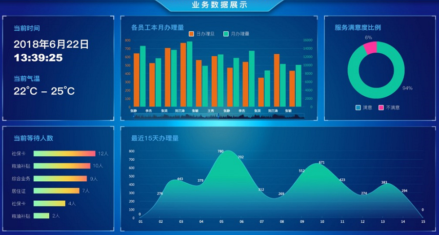 大厅办事人员流量监控系统能够对每个窗口的排队情况进行监控,已经办理完成的数据、正在排队的数据等,窗口工作人员工作状态,暂停服务时间过长预警提醒等的监控。