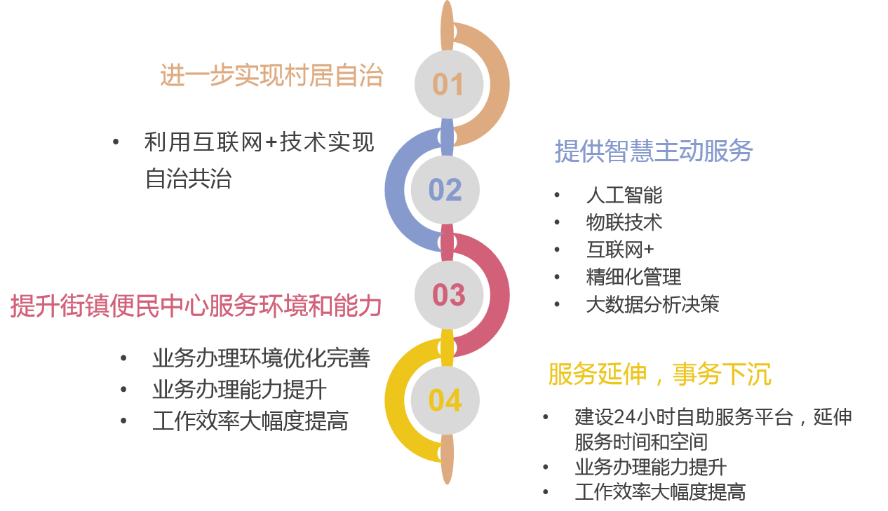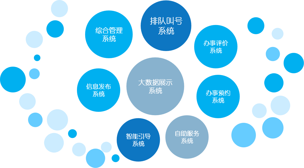 智慧街镇系统方案根据街镇社区事务受理服务中心现场情况设计,以此来改善办事工作环境,提高办事效率,营造良好的服务氛围,为居民提供安静平和的办事环境增加动力。方案以“互联网+政务服务”思路为指导,智慧化信息技术为媒介,简化、优化服务引导程序抓手,主要围绕街镇社区事务受理服务中心信息化建设,深化政务服务应用,整合数据资源,以提高政务服务感知和良好政务服务环境为方向,实现居民办事“跑一次办结”的总目标,通过智慧街镇系统升级,提升办事体验,提高办事效率,优化办事环境,大数据技术对接访量、窗口受理时效、平均办件时长等数据构建模型并展示,为居民办事引导及领导对大厅优化决策提供科学化、可量化、可视化支撑。