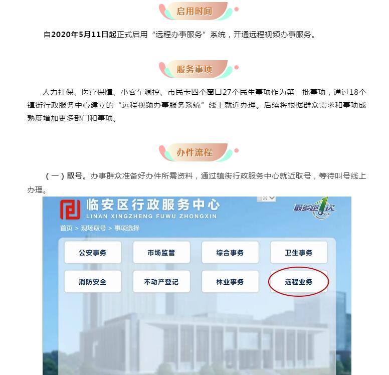 为深化“最多跑一次”改革,方便办事群众就近办事,今日起,临安区行政服务中心正式启用“远程办事服务”系统,为区级中心和镇街平台架起“连心桥”,办事群众可直接在所在镇街行政服务中心取号,通过“远程办事服务”系统视频连线区行政服务中心窗口,进行线上办理。