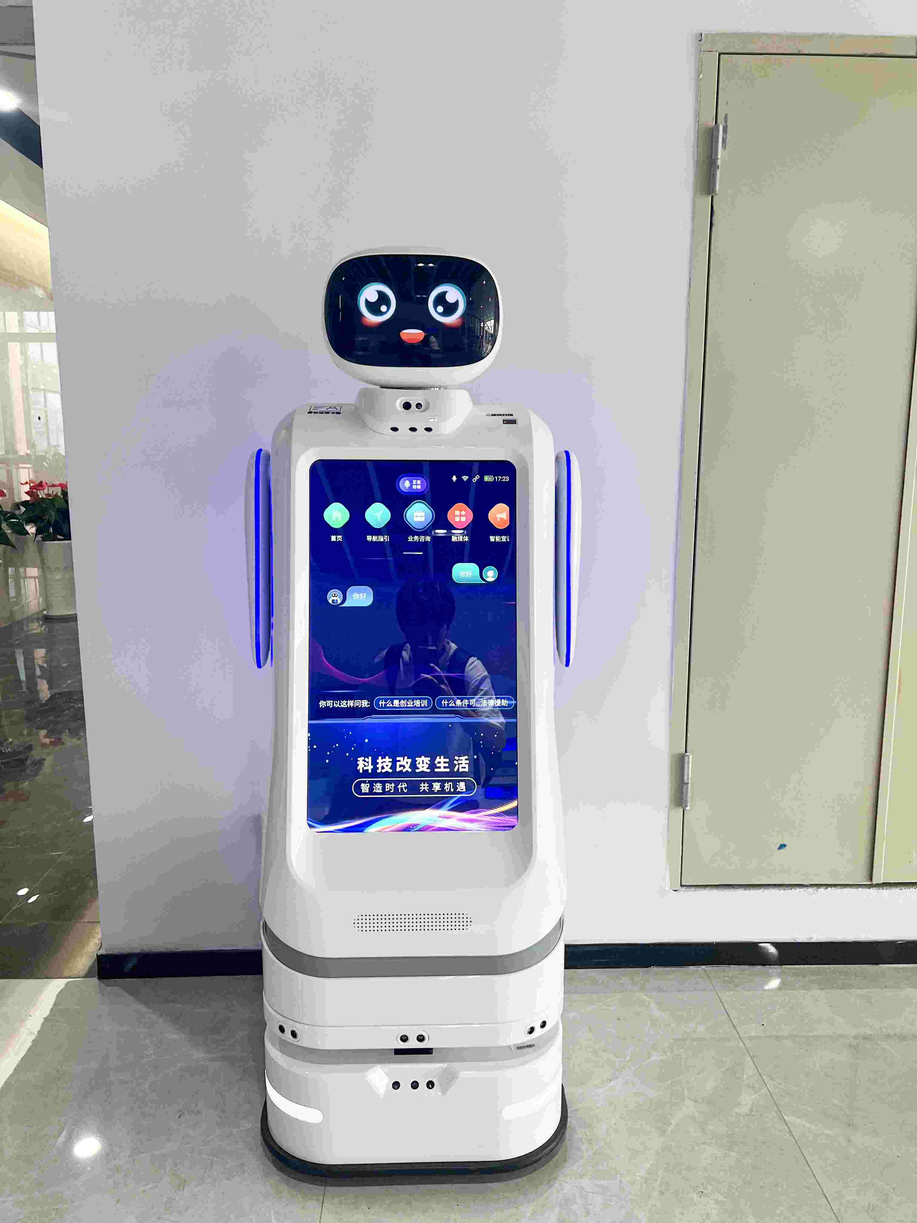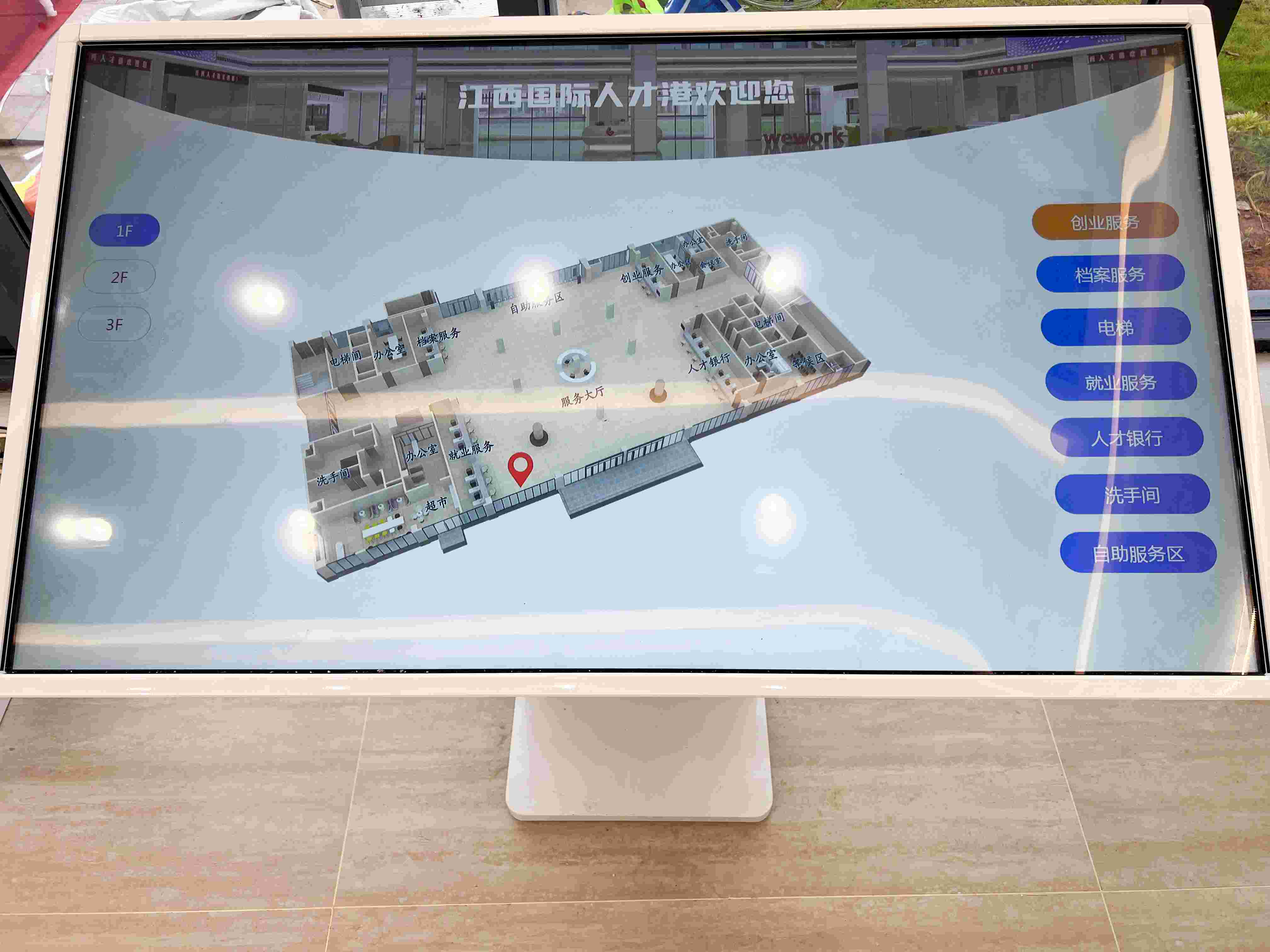 智能引导机:全3D建模,1:1还原人才港每个楼层的布局。想去哪里点哪里,引导路线自动呈现。